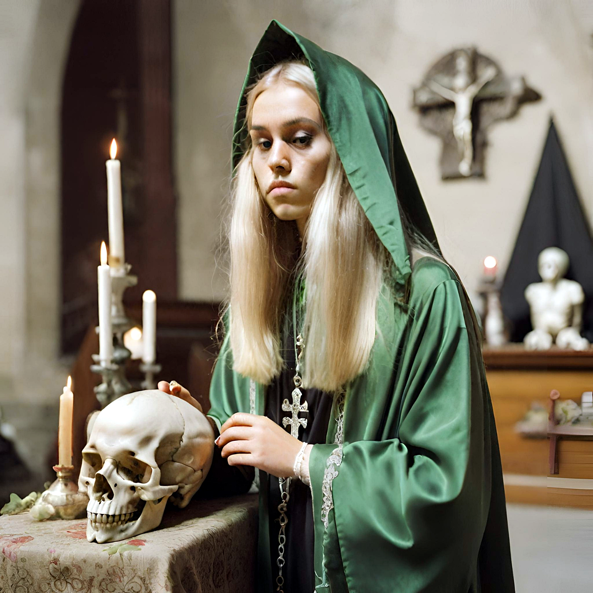 Odalépett az oltárhoz, megnyálazta az ujját, majd ujjaival megérintette a koponya üres szemgödreit. Kötényéből megsárgult lapos kis könyvet vett elő, majd a medált és a hajszálakat.